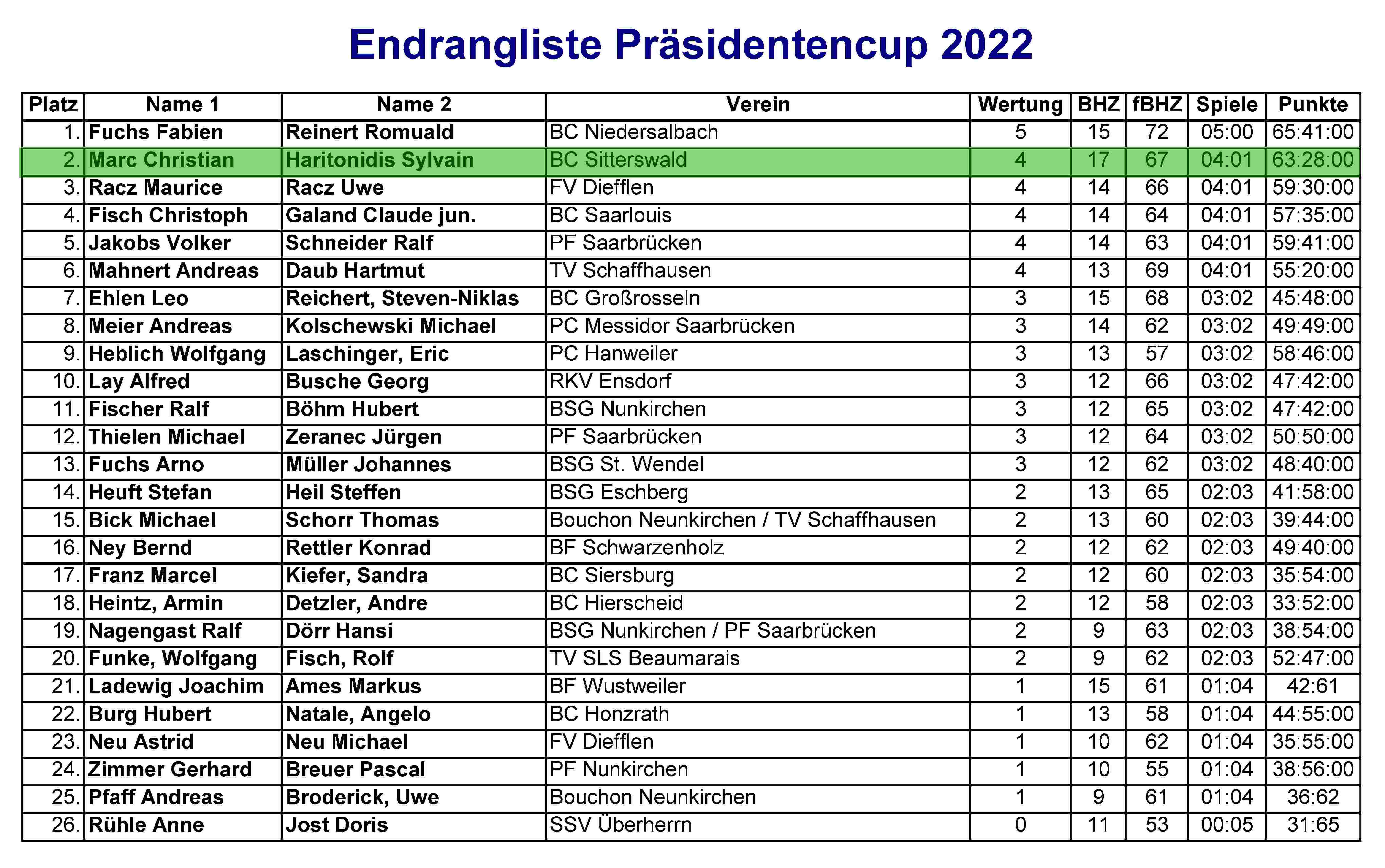 Am Sonntag, dem 16. Januar fand in der Boulehalle Gersweiler der diesjährige Präsidenten-Cup statt. Teilnahmeberechtigt waren je ein Doublette-Team als Repräsentanten eines Vereins. 25 Teams waren am Start. Für die Boule KG Sitterswald traten Christian Marc und Sylvain Haritonidis an. Zu absolvieren waren 5 Runden im Schweizer System. Die ersten 4 Spiele wurden souverän gewonnen. Im letzten Spiel traf man dann auf den Landesmeister 2021 und Bundesligisten Niedersalbach. Schnell führte man 11:2, das Spiel schien gelaufen. Aber dann in scheinbarer Überlegenheit schlichen sich einige Fehler ein, der Gegner wurde daraufhin immer stärker und konnte durch 3er- und 4er-Punktspiele aufholen und am Ende noch mit 13:11 gewinnen. Schade, dass die Konzentration nicht bis zum Ende gehalten werden konnte. Aber so ist Sport. Nichtsdestotrotz ein Achtungserfolg für unser Team. Der 2. Platz im Turnier ist ein Auftakt nach Maß für die Pétanque-Saison 2022.