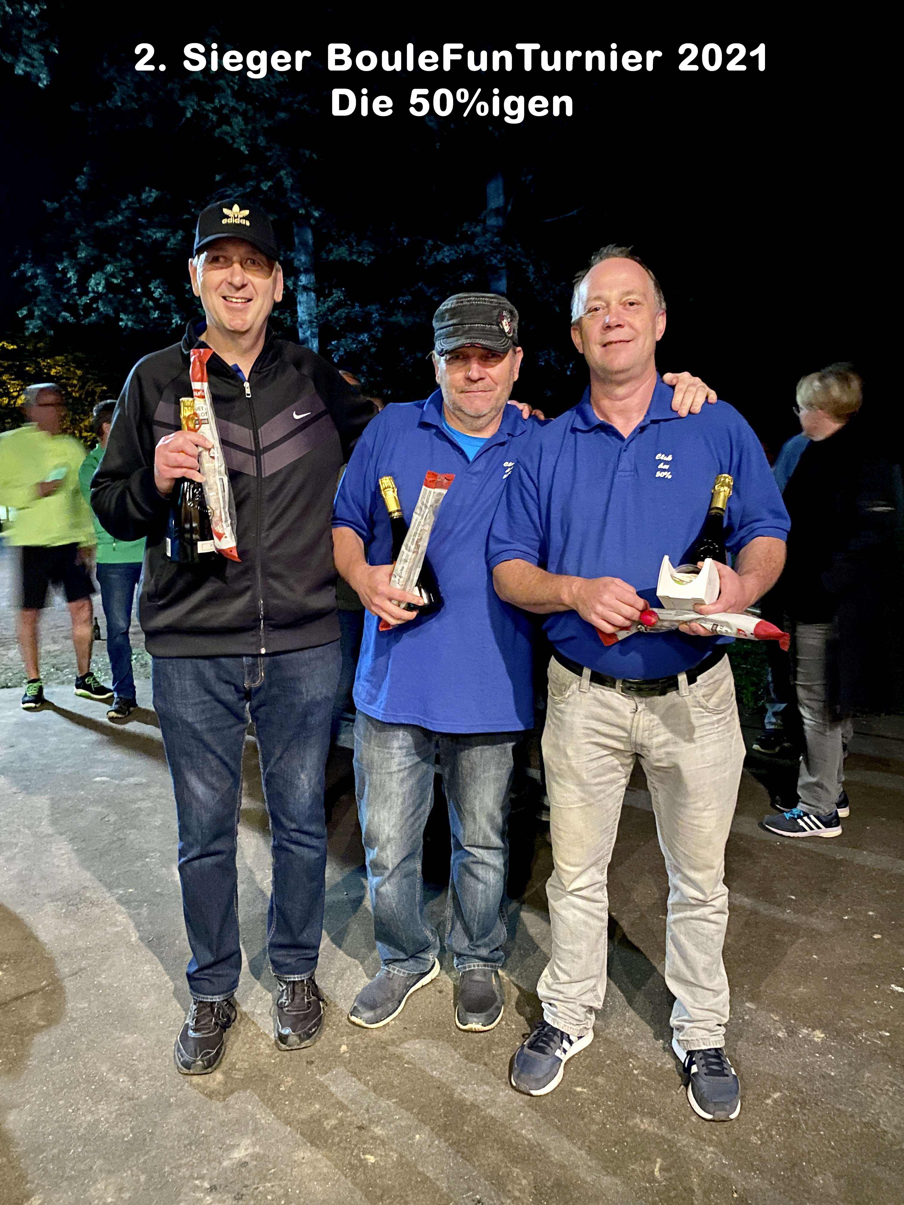 Großes Finale: Club der 50%igen gegen die Sackwerfer Auersmacher. Von 50% war nun keine Rede mehr, das Team um Erwin musste nun 100% und mehr geben, denn die Sackwerfer entpuppten sich im Finale als gefährliche Gegner, die mit guter Legerleistung die 50%igen zur Verzweiflung brachten. Das Spiel wogte hin und her, mal lag der Eine, mal der Andere vorne. Die 50%igen konnten sich durch solide Schießerleistung einen kleinen Vorteil verschaffen und führten in der Partie mit 12:10. Doch dann passierte das, was in solchen Spielen oft passiert. Der Schütze der 50%igen konnte die gut platzierten Kugeln nicht eliminieren und die Leger patzten unter dem nun entstandenen Druck. Das war die Stunde der Sackwerfer, sie platzierten noch 2 geniale Kugeln direkt am Cochonnet und der Sieg war perfekt. Unter dem Beifall der Zuschauer, die links und rechts des Platzes saßen, bejubelten die Sackwerfer ihren Sieg.