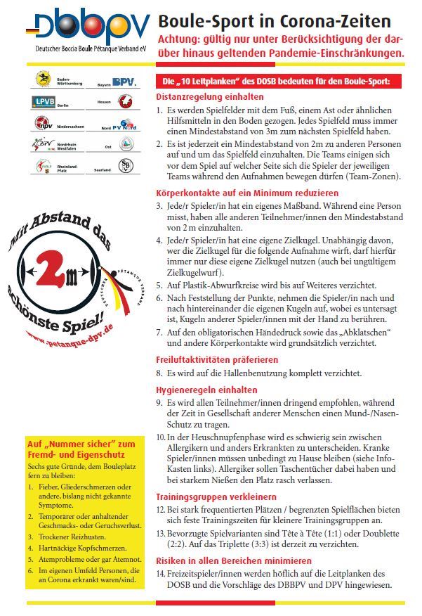...wir dürfen wieder auf unseren Bouleplätzen trainieren. Die Landesregierung hat mit dem Beschluss vom 2.5.2020 uns und anderen Sportarten wieder erlaubt unsere Sportart im freien und unter den bekannten Vorkehrungen auszuüben. Der DPV ist vorbereitet und hat eine Zusammenfassung mit aufgestellt. Diese wurden vom DOSB sehr gelobt und befürwortet.